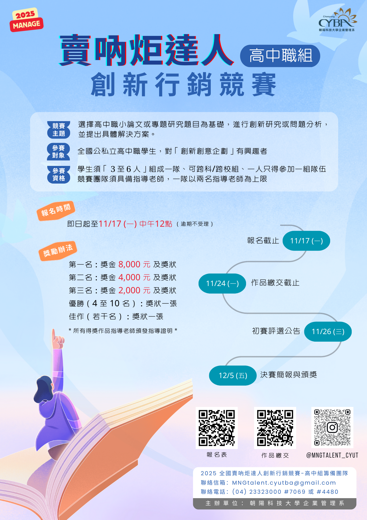 檢送朝陽科技大學企業管理系主辦之「2025全國賣吶炬達人創新行銷競賽-高中職組」比賽辦法