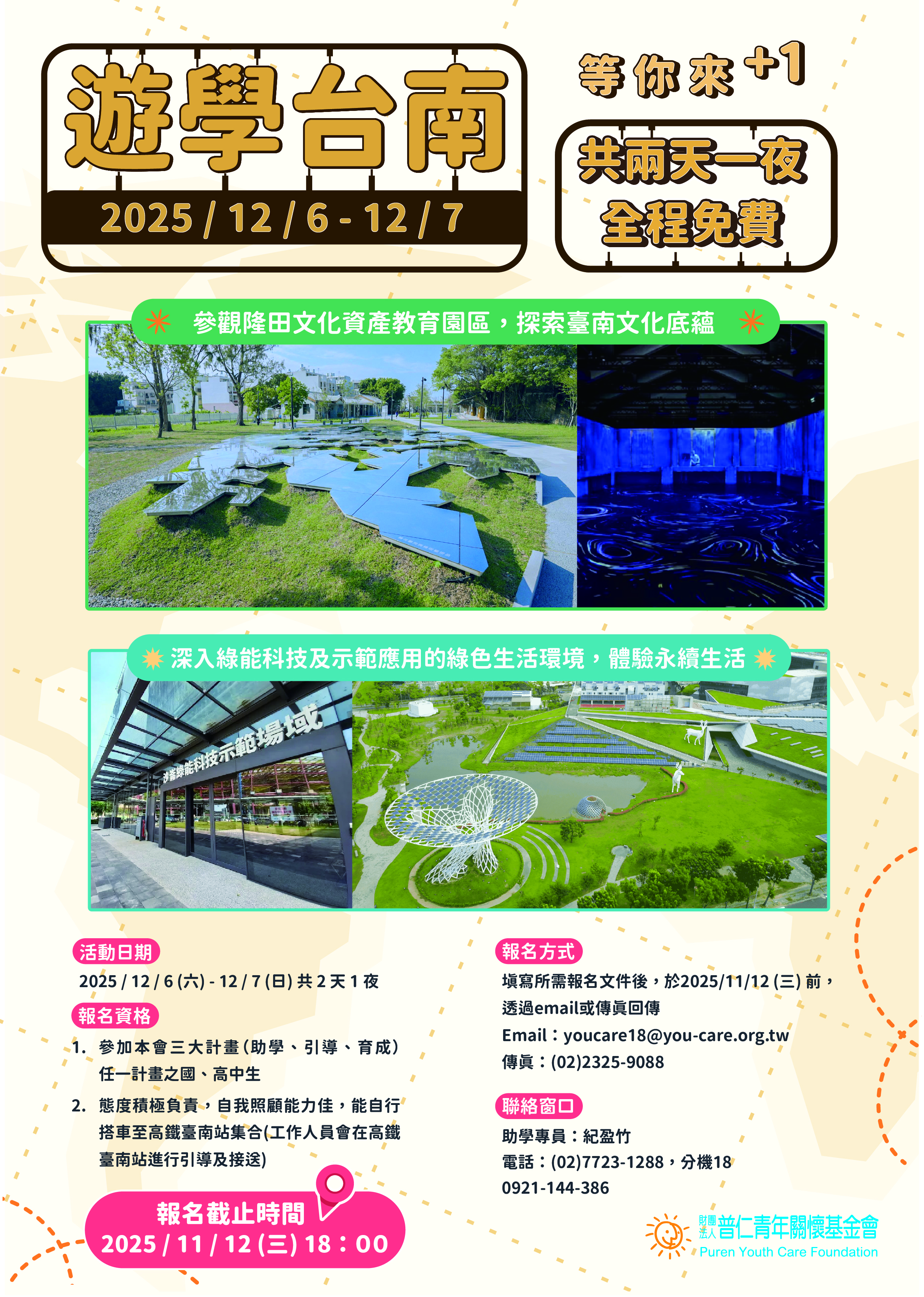 - 普仁青年關懷基金會將於2025年12月6日(六)至12月7日(日),舉辦2025年遊學臺南青少年體驗活動,費用全免,凡參與普仁青年關懷基金會助學計畫、引導計畫或育成計畫之國、高中生皆可報名。